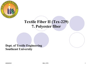 Polyester is the most commonly used synthetic fiber. It is manufactured through a condensation reaction between an organic alcohol and a carboxylic acid, forming an ester linkage. Polyester fibers have properties like resilience, wrinkle resistance, shape retention, durability and washability. However, they also have disadvantages like poor moisture absorption and generating static electricity. Polyester is dyed using disperse dyes at high temperatures via HTHP or carrier methods. It has many uses including in clothing fabrics due to its desirable qualities.