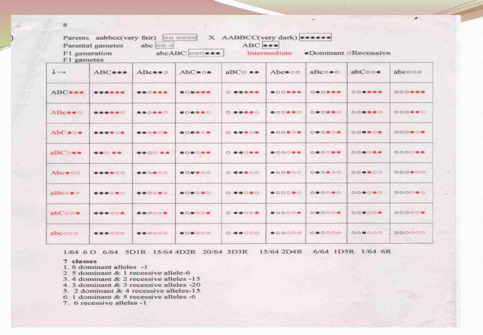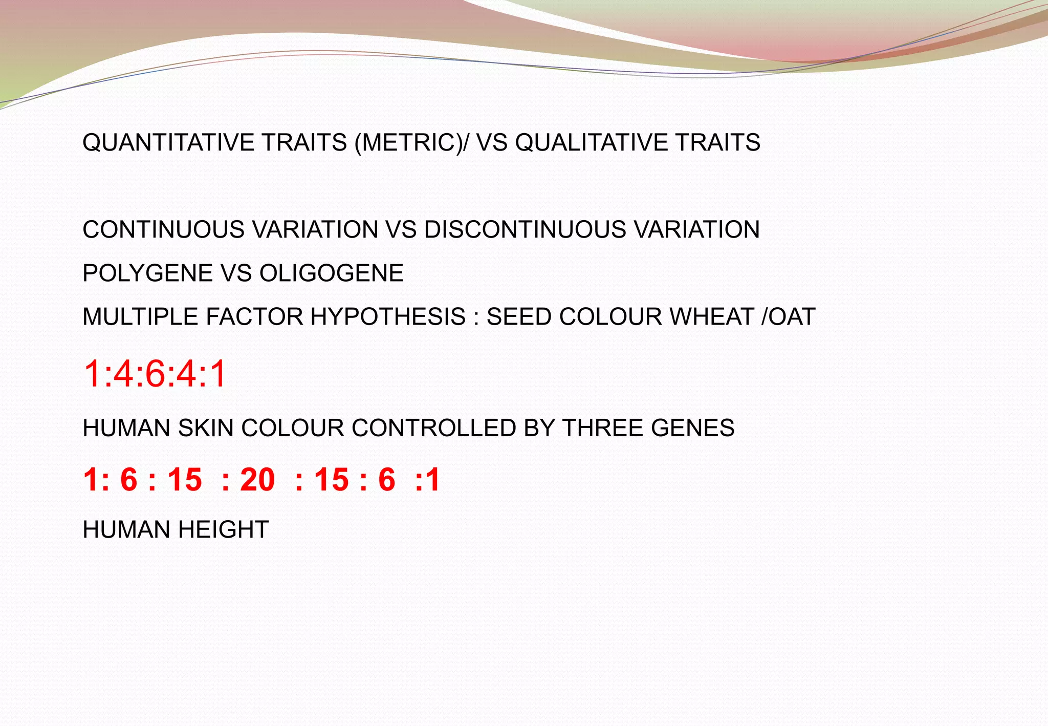 The document discusses polygenic inheritance, explaining how quantitative traits such as human skin color and height are influenced by multiple genes and environmental factors. It contrasts these traits with Mendelian traits, highlighting continuous variation and the additive effects of alleles. Historical examples, such as those from Yule and Ehle, illustrate the cumulative nature of polygenic traits in organisms, demonstrating complex inheritance patterns that do not fit Mendelian expectations.