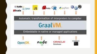 This document provides a high-level summary of GraalVM and its capabilities for running applications and languages on the Java Virtual Machine. Specifically, it discusses how GraalVM allows running JavaScript, Python, Ruby, R, Java and C/C++ efficiently on the JVM through projects like Truffle and Substrate. It also summarizes GraalVM's polyglot capabilities for interoperability between languages and ahead-of-time compilation of Java into native binaries.
