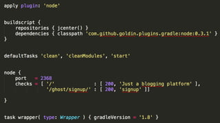 The document summarizes a presentation by Evgeny Goldin given at Gradle eXchange in London on October 28, 2013 about using Gradle as a build tool for polyglot projects involving Node.js and Play. It discusses using Gradle to automate tasks like starting and stopping Node.js servers, versioning Node.js dependencies, and integrating Gradle with other tools like Jenkins, Chef, MongoDB, Redis, Grunt and Play. The presentation explores how Gradle could serve as a unified build tool for projects using multiple languages and frameworks.