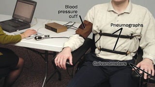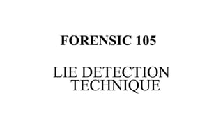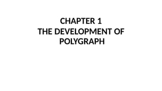 The document discusses polygraphy, a scientific method for detecting deception through physiological changes in response to questions, and explains the evolution and functioning of polygraphs. It details various historical methods of detecting lies, early contributors to polygraph technology, and definitions of various related terms such as types of liars and signs of lying. The text emphasizes the importance of understanding physiological responses and historical context in the examination of deception.