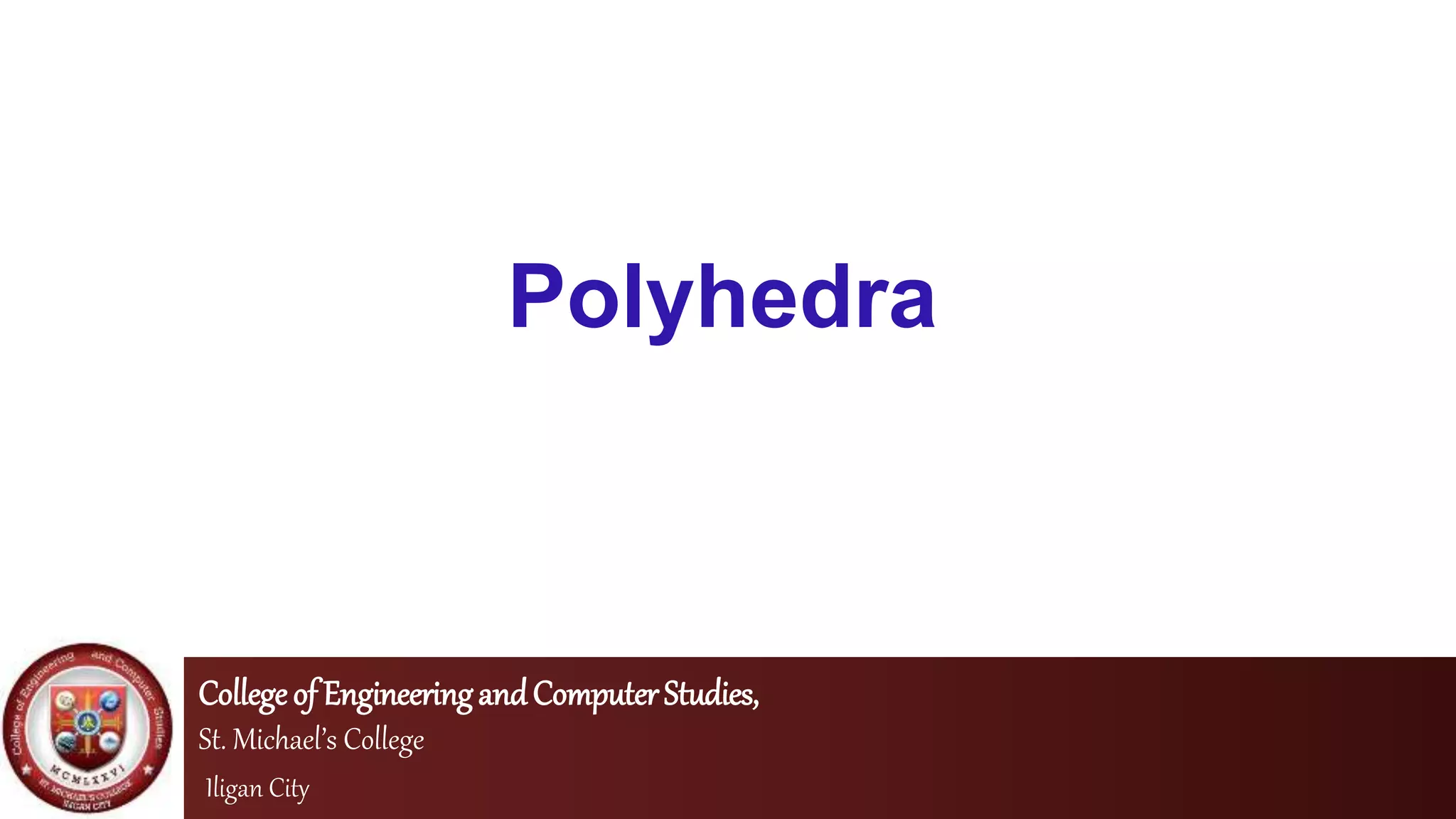 The document discusses polyhedra and defines a polyhedron as a solid bounded by planes. It describes prisms and cylinders as solids whose volume is equal to the product of the base area and altitude. Prisms are defined as polyhedra with two equal polygon bases that are parallel, and parallelogram sides. The elements of a prism including its base, altitude, axis, edges and vertices are identified. Examples of common prisms like cubes and rectangular prisms are provided.