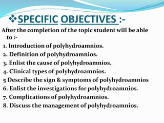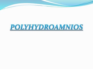 This document discusses polyhydroamnios, which is an excess of amniotic fluid during pregnancy. It defines polyhydroamnios as amniotic fluid exceeding 2000 ml or an amniotic fluid index greater than 24 cm. Potential causes include fetal anomalies, multiple pregnancies, or idiopathic cases. Signs and symptoms range from abdominal pain and difficulty breathing with acute cases to leg swelling and discomfort with chronic cases. Ultrasound and amniocentesis are used for diagnosis. Complications include preterm labor and cord prolapse. Management may involve medications, monitoring, and in severe cases, early delivery.