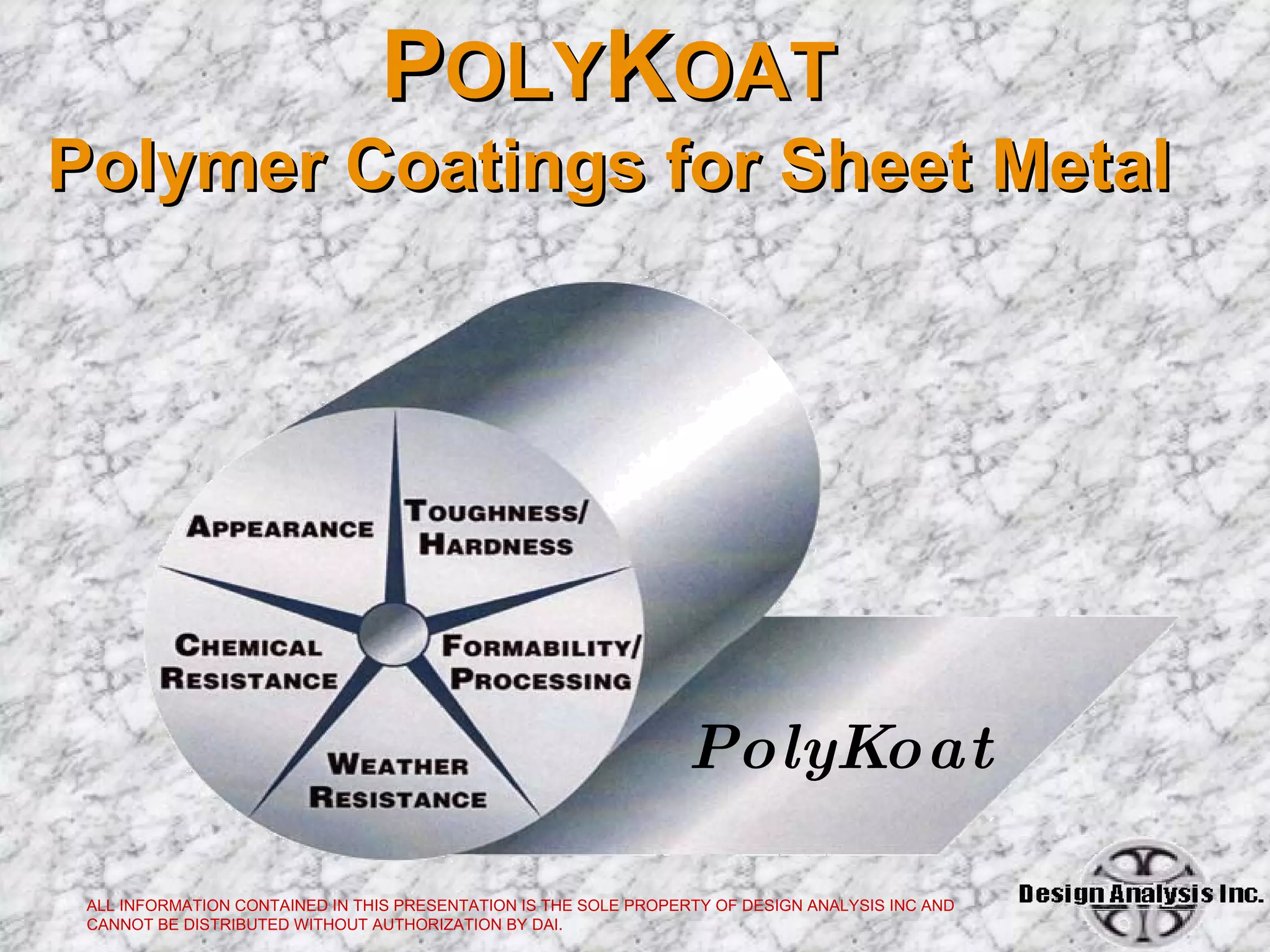 PolyKoat is a polymer coating developed by Design Analysis Inc. for sheet metal. It provides superior abrasion and weather resistance compared to paint or epoxy coatings. PolyKoat coatings are environmentally friendly as they contain no VOCs or BPA. They can be formed into complex shapes without cracking or peeling like painted metals. Extensive testing has shown PolyKoat withstands chemicals, impacts, and long-term outdoor exposure better than traditional coatings.