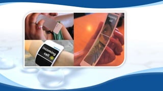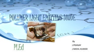 PLEDs use semiconducting polymers that emit light when electric current is applied. They provide more efficient LED displays than traditional LEDs, and are useful for portable device displays due to their flexibility and thinness. PLEDs have an anode, cathode, and polymer film sandwiched between them. When voltage is applied, the polymer emits light. PLEDs can be flexible, transparent, or stacked to provide different display types and colors. They have advantages over LCDs like lower power use and wider viewing angles, but shorter lifetimes. PLEDs are being developed for applications like phones, watches, TVs, and more.