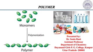 Dr. Sonia Rani presented on polymers. She defined key terms like monomers, polymers and polymerization. Polymers are classified based on their source (natural, semi-synthetic, synthetic), structure (linear, branched, cross-linked) and molecular forces. The two main types of polymerization reactions are addition/chain growth and condensation/step growth. Important addition polymers like polythene, polypropylene and nylon were discussed along with their preparations. Copolymerization and natural rubber were also summarized.