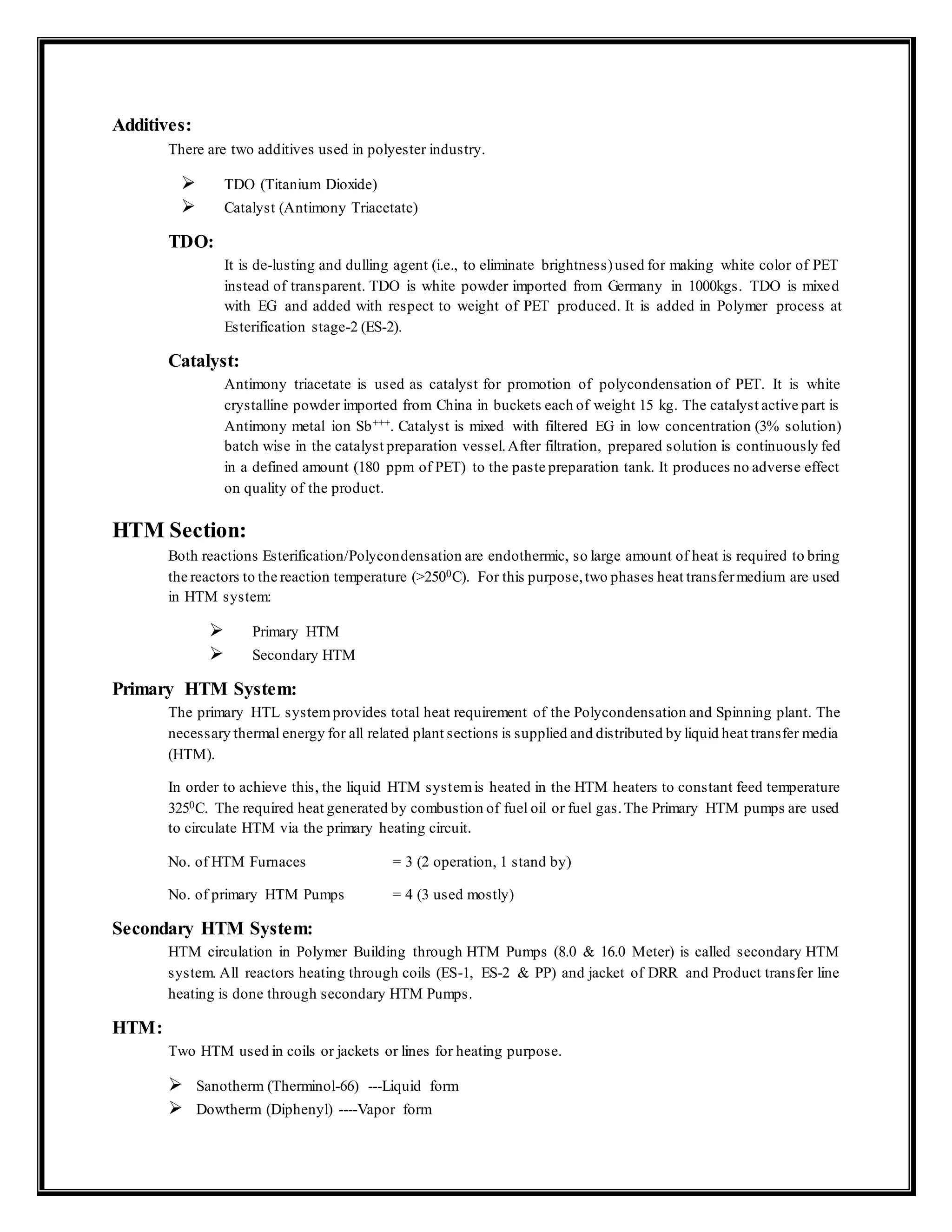 There are two additives - titanium dioxide (TDO) and antimony triacetate catalyst - used in the polyester process. TDO is added at the Esterification Stage 2 (ES-2) to make PET dull or white in color. The catalyst promotes the polycondensation reaction. The polymer process involves paste preparation, two stages of esterification (ES-1 and ES-2), pre-polycondensation, and polycondensation in a disc ring reactor. Heat is provided through a primary and secondary heat transfer medium system to maintain the required high temperatures.