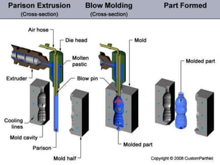 This document discusses various polymer processing and molding techniques. It describes compression molding, extrusion molding, injection molding, and blow molding. Compression molding involves placing polymer material into a mold, applying heat and pressure to form the shape. Extrusion molding uses a screw to force melted polymer through a die to create shapes. Injection molding uses a reciprocating screw to inject melted polymer into a mold cavity. Blow molding forms hollow plastic parts by extruding or injecting a tube then inflating it against a mold with compressed air.