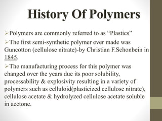 - The first synthetic polymer was celluloid in 1845, while Bakelite in 1872 was one of the earliest plastics. Many common polymers like polyethylene and PVC were invented in the 1930s.