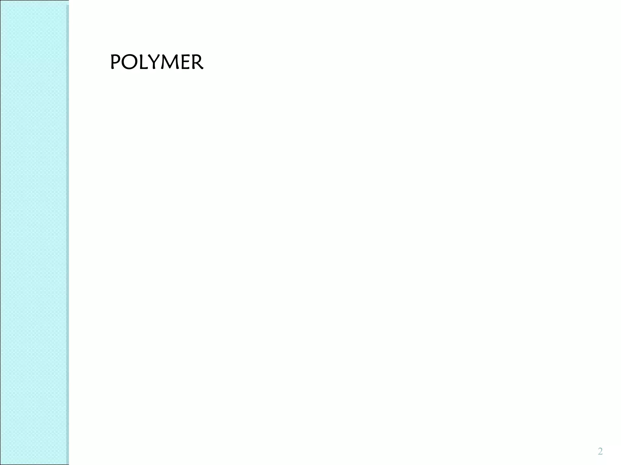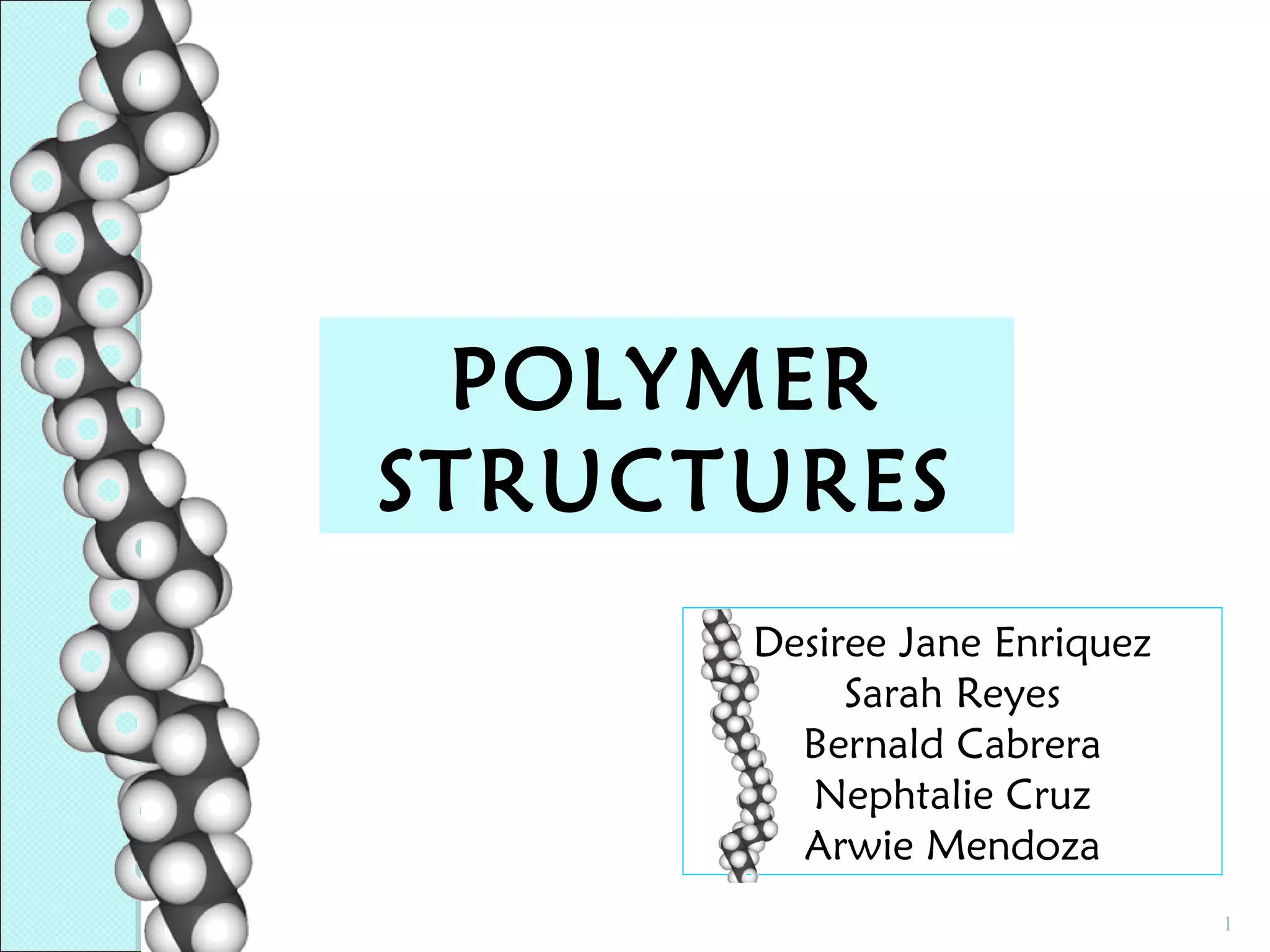This document discusses polymer structure and composition. It begins by describing natural polymers like wood, cotton and rubber that were originally used. It then discusses the development of synthetic polymers like plastics, rubbers and fibers. Most polymers are hydrocarbons made of carbon and hydrogen. Polymers can have different compositions and structures including linear, branched, cross-linked and network configurations. The properties of a polymer depend on factors like its molecular weight, end-to-end distance, tacticity and crystallinity. Common techniques for characterizing polymers include determining the number average and weight average molecular weights.