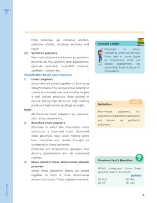 The document provides an extensive overview of polymers, including classifications such as natural, semisynthetic, and synthetic polymers, as well as their structural types like linear, branched, and cross-linked polymers. It discusses the polymerization processes including addition and condensation, and details various examples, applications, and properties of specific polymers such as natural rubber, nylon, and Teflon. Additionally, it addresses the significance of vulcanization in improving the properties of rubber and presents questions from previous exams for assessment.