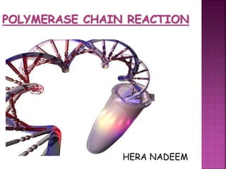 Polymerase chain reaction (PCR) is a technique for amplifying DNA sequences in vitro. It involves repeated cycles of separating DNA strands through heating and cooling, and using DNA polymerase to make copies of the target sequence. PCR was first proposed in the 1970s and developed in the 1980s by Kary Mullis, who received the Nobel Prize in Chemistry for his work. PCR uses DNA polymerase, primers, nucleotides, and repeated heating and cooling to amplify a specific DNA sequence over a billion-fold, allowing for easy detection and analysis.