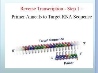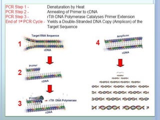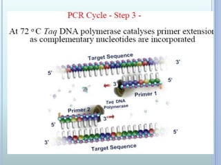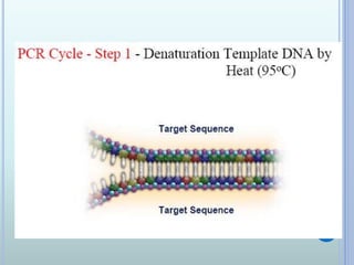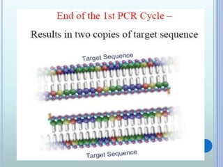 Polymerase chain reaction (PCR) is an in vitro technique used to amplify a specific region of DNA. It involves repeated cycles of heating and cooling of the DNA sample in the presence of primers, DNA polymerase, and dNTPs. Each cycle doubles the amount of target DNA. Real-time PCR permits both amplification and simultaneous quantification of the target DNA by using fluorescent dyes. It has various applications including disease diagnosis, gene expression analysis, and food testing.