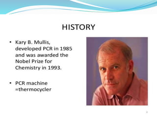 PCR is an advanced molecular biological technique used to amplify a segment of DNA by producing thousands to millions of copies of that segment within a short period of time, allowing for further analytical studies. It works by using a PCR machine to replicate the targeted DNA segment in multiple cycles of heating and cooling.
