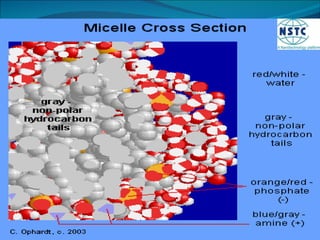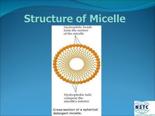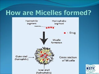 Micelles are small spherical structures composed of surfactant molecules that form to reduce surface tension in a cell membrane. When the concentration of surfactant reaches a critical point known as the critical micelle concentration, the hydrophobic tails organize to form micelles with the hydrophilic heads on the outside in water. Micelles can be used as drug carriers, with polymers forming stable spherical structures below a certain size that allow accumulation of drugs in tissues like tumors.