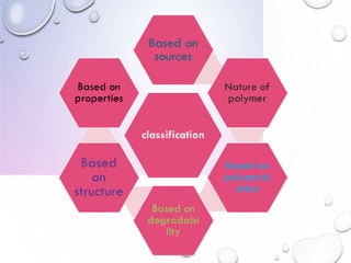 This document discusses polymers, including their definition as large molecules formed by linking repeating structural units. Polymers are classified in various ways, including by source, polymerization type, degradability, and properties. Ideal polymers are inert, non-toxic, easily administered, have good mechanical strength, and are biodegradable and biocompatible. Polymers have advantages like localized drug delivery and sustained release, while disadvantages can include dose dumping and low mechanical properties. The document outlines applications of polymers in drug delivery systems, including for controlled and sustained release, as well as in biomedical uses like tissue engineering and surgical adhesives.