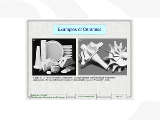 The document discusses the fundamentals of polymers, ceramics, and composite materials, examining their properties, manufacturing processes, and applications. It highlights different types of plastics, biodegradable options, and the critical factors influencing material selection in design. Additionally, it covers various ceramic types, their mechanical properties, as well as the characteristics and applications of reinforced plastics and metal matrix composites.