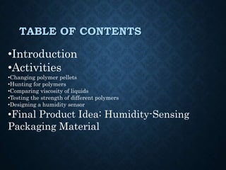 The document discusses various activities related to the study of polymers, including changing polymer pellets, comparing viscosities, and testing tensile strength. It details the design of a humidity-sensing packaging material aimed at preventing food spoilage in high-humidity conditions, particularly for items like dates. The conclusion emphasizes the potential applications of the humidity sensor in various food packaging scenarios and acknowledges the support received during the project.