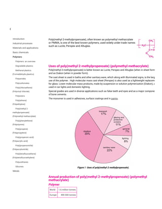Poly(methyl 2-methylpropenoate), also known as polymethyl methacrylate (PMMA), is a clear plastic that is used in various applications like sanitary ware, signs, replacement glass, and car lights. It is produced from methyl methacrylate monomer, which is mainly made from propanone and hydrogen cyanide or from ethene, carbon monoxide, and methanol. The polymer is made through free radical polymerization of the monomer, which can be done in bulk, solution, suspension or emulsion. Co-polymers are also used for properties like increased thermal stability.