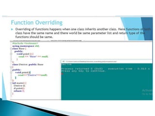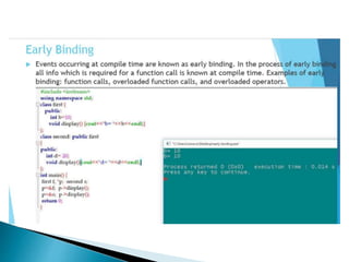 A pointer can point to an object by holding the object's address value. This is known as a "this pointer". A derived class inherits properties from its base class. A pointer to the base class can point to a derived class object, allowing access to both base and derived class members. Virtual functions ensure the correct overridden function is called at runtime based on the actual object type, rather than the pointer type. They are declared with the virtual keyword in the base class.