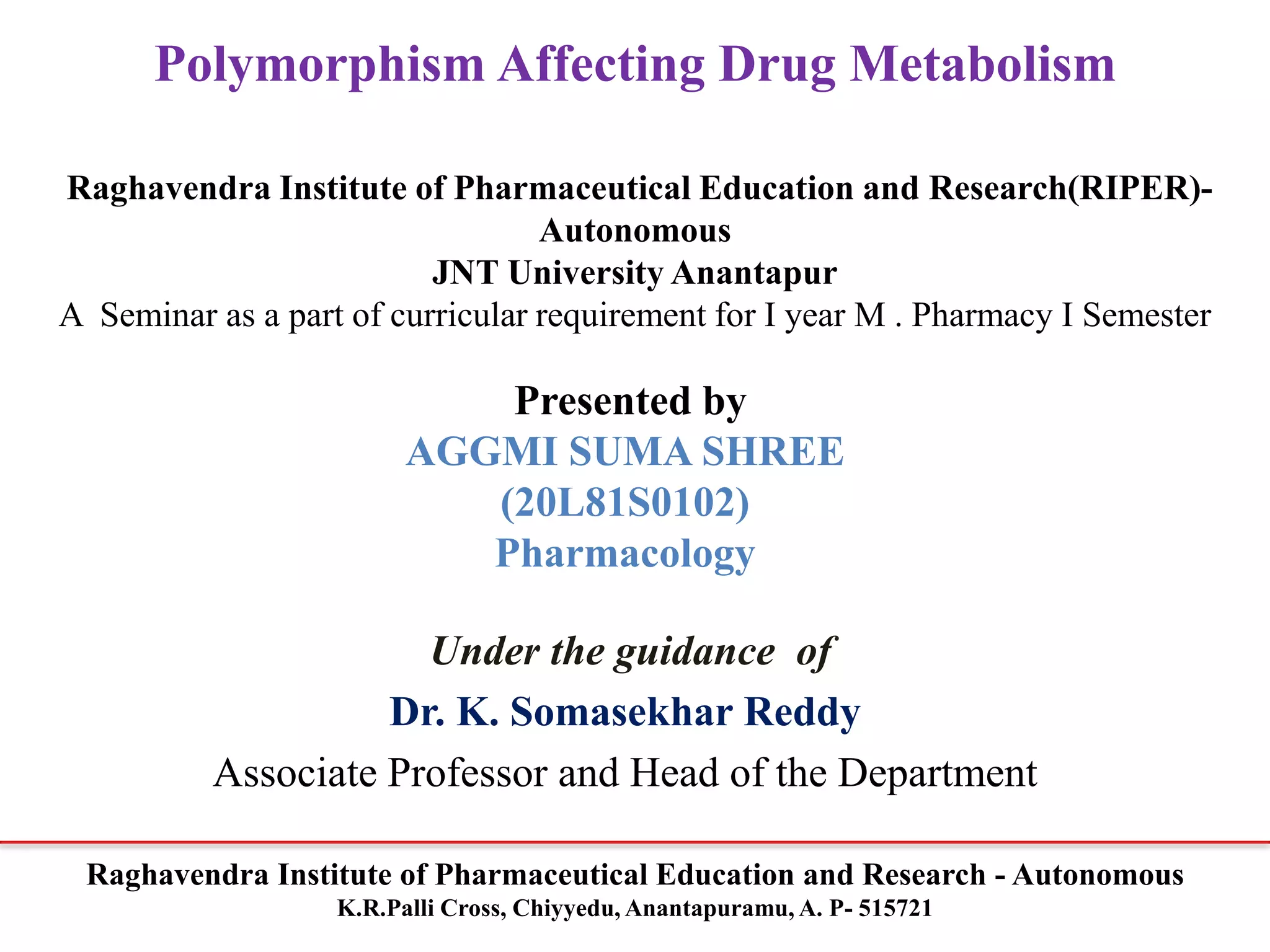 The document discusses genetic polymorphism and its impact on drug metabolism, highlighting how variations in DNA sequences can affect enzyme functions responsible for biotransformation of drugs. It explores types of polymorphisms, their causes, and the influence of genetic differences on drug metabolism efficiency across different populations. The document emphasizes the role of cytochrome P450 enzymes and the implications of genetic variations for therapeutic outcomes and adverse drug reactions.