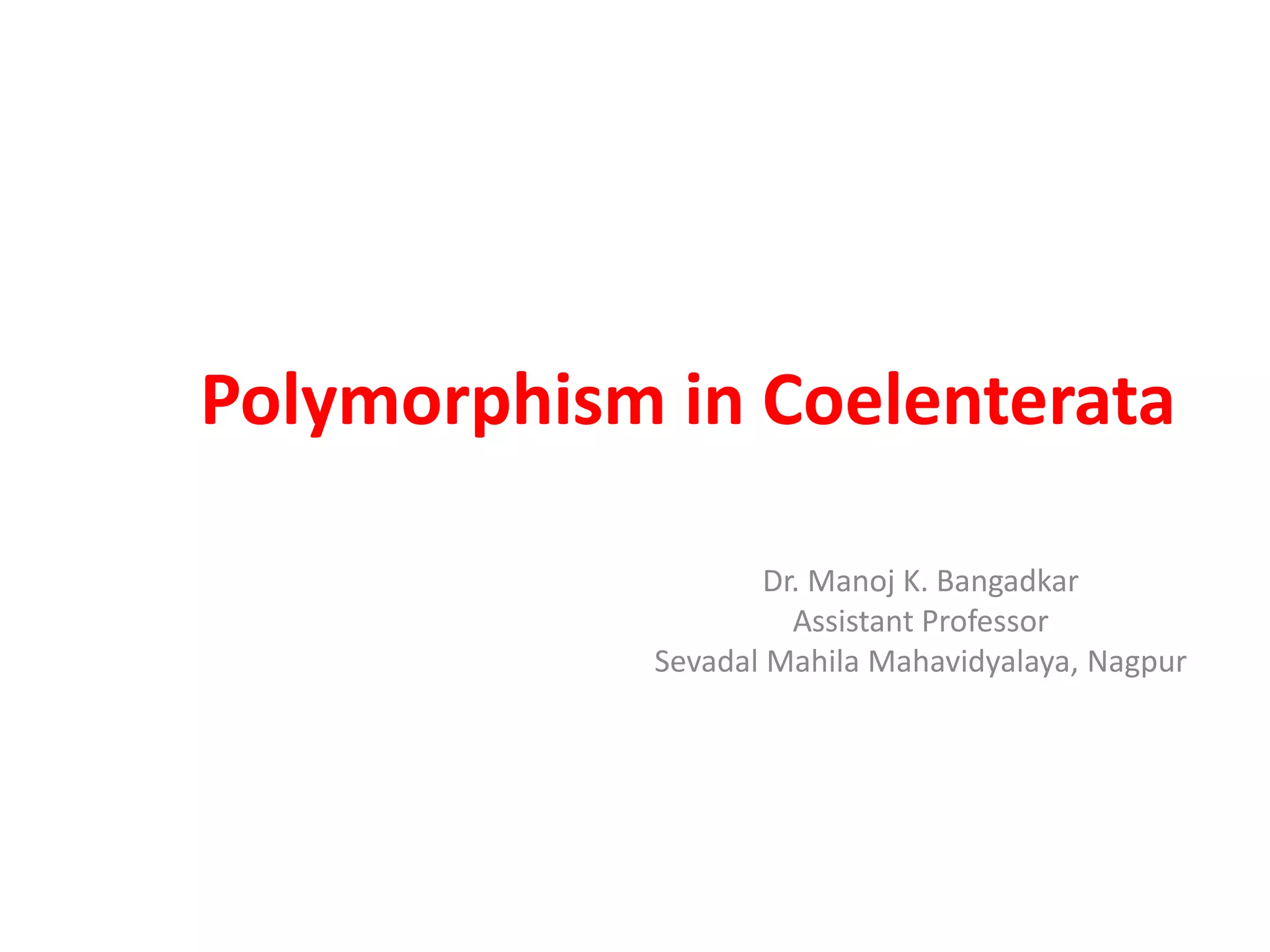 Polymorphism in coelenterates refers to the presence of multiple structurally and functionally distinct individuals, known as zooids, within a population. Hydrozoa, a class within the phylum, showcases various zooid forms including polyps and medusae, each adapted for specific functions such as feeding, defense, and reproduction. The phenomenon signifies a division of labor, enhancing the survival and efficiency of colonial organisms.