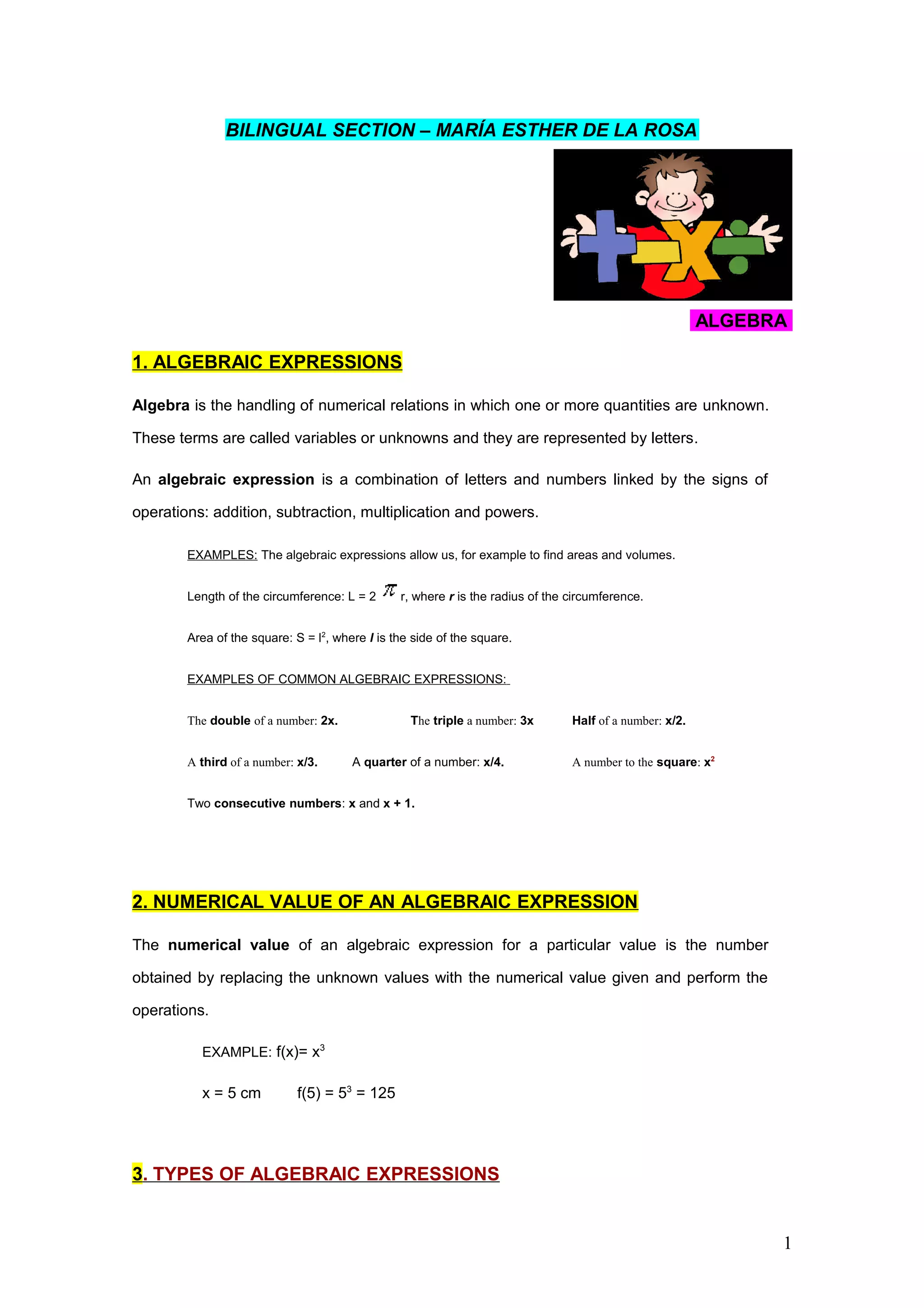 This document provides an overview of algebraic expressions and operations with polynomials. It defines algebraic expressions as combinations of letters and numbers using operations like addition, subtraction, multiplication, and exponents. Monomials are single-term expressions while polynomials can have multiple terms. The key operations discussed are adding and multiplying polynomials by distributing terms. Factoring polynomials uses techniques like removing common factors, applying identities like the difference of squares, and recognizing perfect square trinomials.