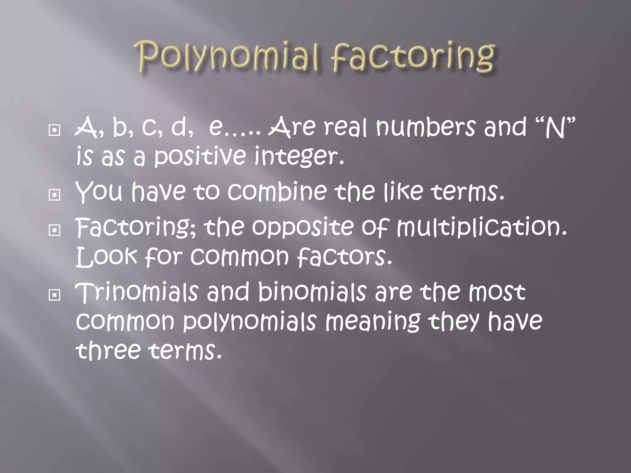 The document discusses polynomials and their factoring. It defines polynomials as expressions with real number coefficients and positive integer exponents. Polynomials can be factored by finding common factors. The most common polynomials are trinomials and binomials, which have three and two terms respectively. Examples of polynomial and non-polynomial functions are provided. The shape of polynomial graphs changes as the degree or leading coefficient changes. Key terms discussed include degree, leading coefficient, factored form, and standard form.