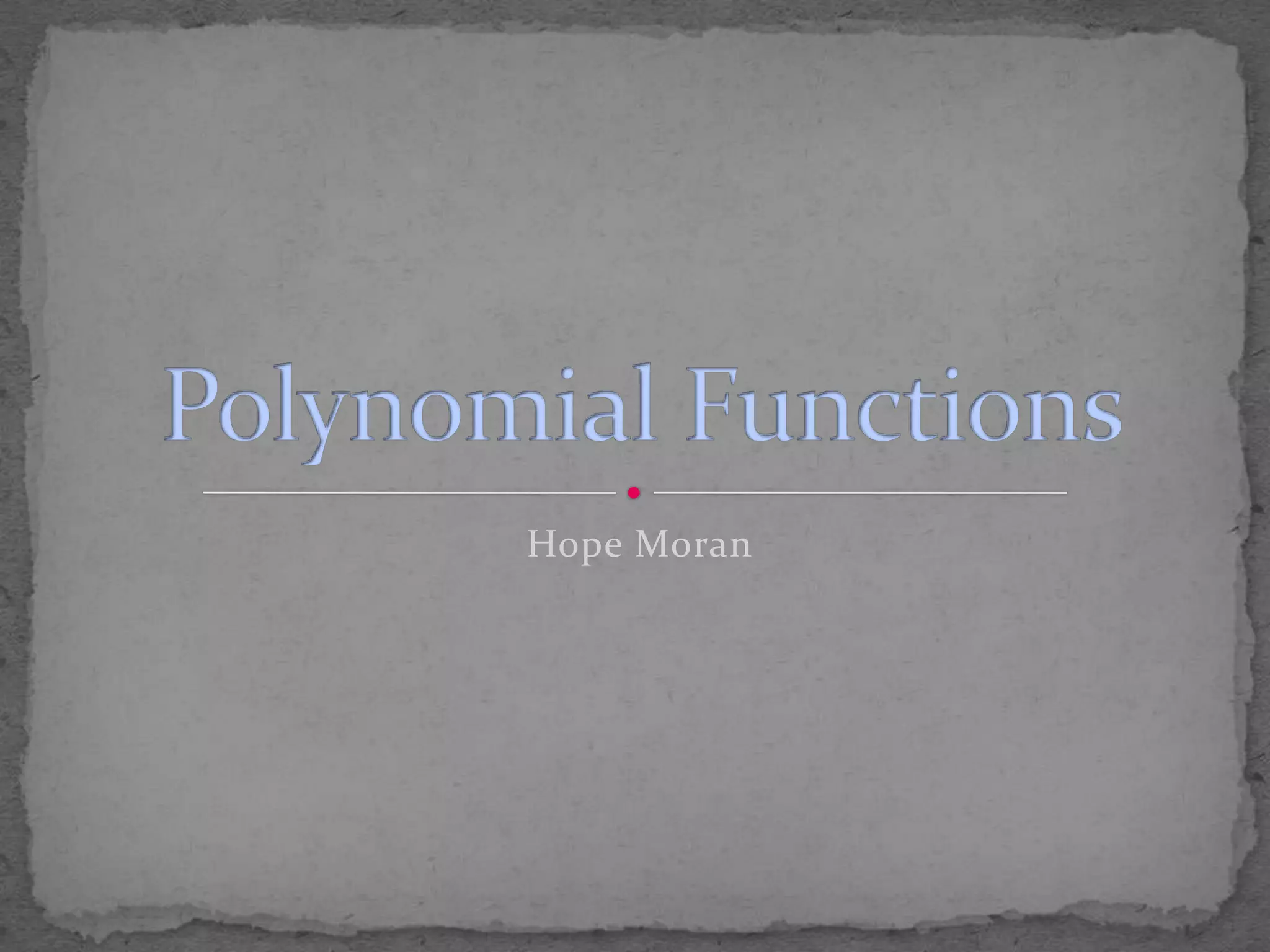 This document defines and explains polynomial functions. A polynomial function can be written as F(x)= ax^n + bx^n-1 + cx^n-2, where a, b, c, etc. are real numbers, x is the variable, and n is a positive integer that determines the degree. The degree refers to the highest power of x, and the leading coefficient is the number that multiplies the term with the highest power of x. Standard form arranges the terms in descending order without parentheses, while factored form fully factors the polynomial into linear factors.