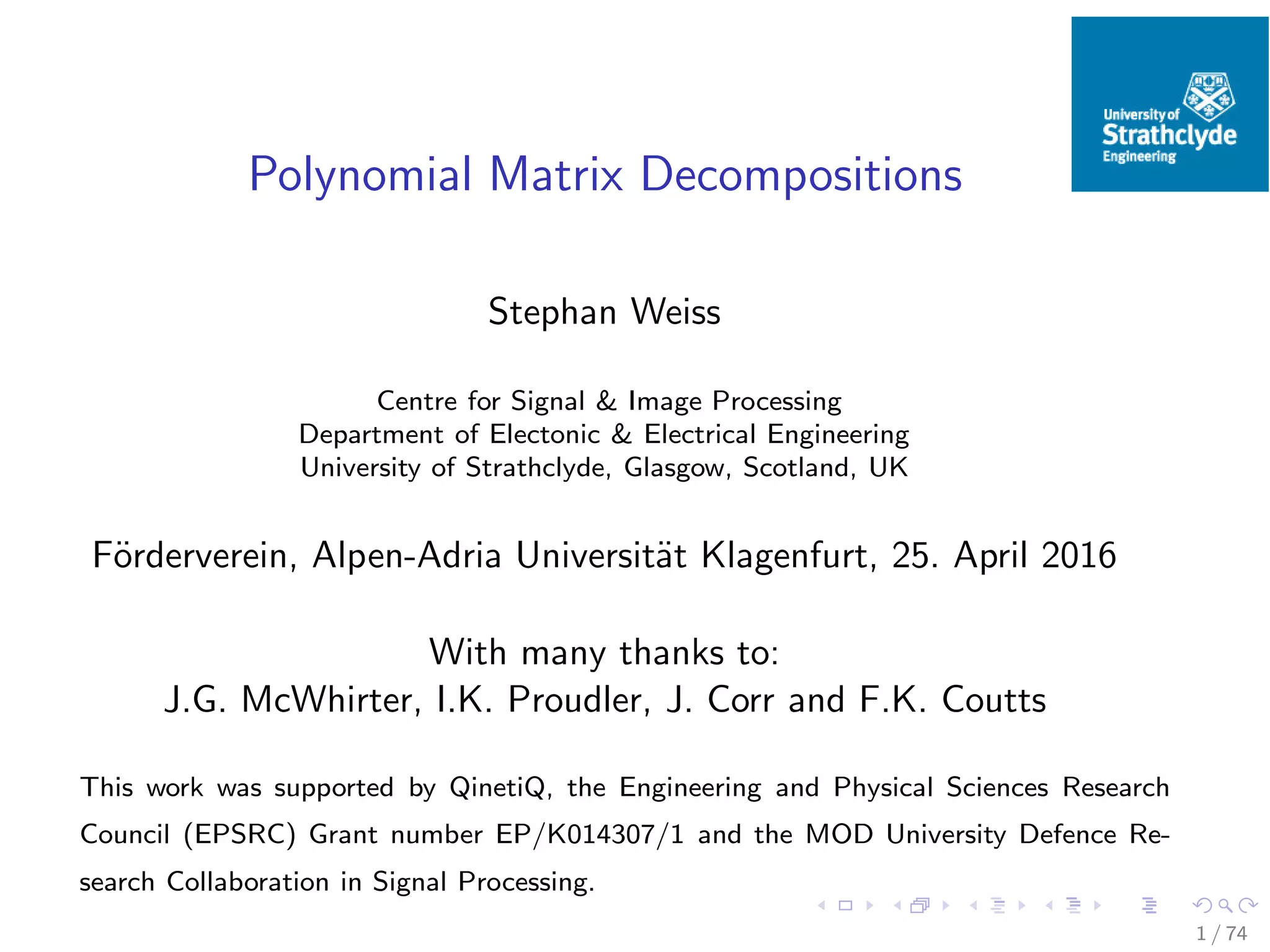 The document is a comprehensive overview of polynomial matrices and their applications in MIMO systems, filter banks, and beamforming techniques. It covers concepts such as polynomial eigenvalue decomposition (PEVD), paraunitary matrices, and the implementation of these theories using MATLAB toolboxes. Supported by research grants, it details algorithms and applications in signal processing, including broadband angle of arrival estimation and source separation.