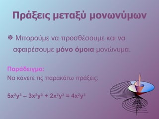 Πράξεις μεταξύ μονωνύμωνΜπορούμε να προσθέσουμε και να αφαιρέσουμε μόνο όμοια μονώνυμα. Παράδειγμα: Να κάνετε τις παρακάτω πράξεις: 5 x 2 y 3 – 3x 2 y 3 + 2x 2 y 3 = 4x 2 y 3