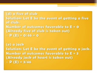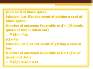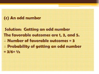 - Examples demonstrate calculating probabilities from the number of favorable outcomes for different