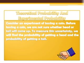 This document discusses theoretical and experimental probability. It provides examples of calculating probabilities from experiments and outcomes. Some key points: