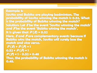 - Complementary events have probabilities that sum to 1, so the probability of an event can be found by subtracting its complement's probability from 1.
