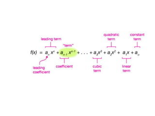 A polynomial function is a function where all exponents are non-negative integers. It is of the form f(x) = anxn + an-1xn-1 + ... + a1x + a0, where n is a non-negative integer and the coefficients ai are real numbers. The degree of a polynomial is the highest exponent present, and the leading coefficient is the coefficient of the term with the highest degree. The end behavior of a polynomial function can be determined by looking at the sign of the leading coefficient and whether the highest degree is even or odd. A polynomial function has at most n real zeros, where n is its degree, and at most n-1 turning points.