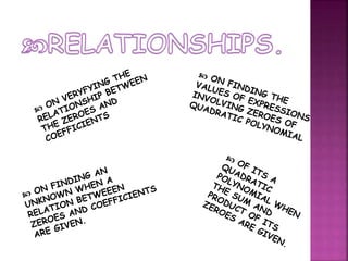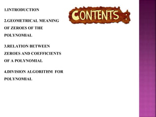 This document discusses polynomials and their properties. It defines polynomials as algebraic expressions involving variables and real numbers. It describes the different types of polynomials based on the number of terms they contain such as monomials, binomials, and trinomials. The document also discusses the degree of a polynomial as well as the maximum number of real zeros a polynomial can have based on its degree. Additionally, it provides relationships between the zeros and coefficients of polynomials. Finally, it introduces the division algorithm for polynomials and how it can be used to verify if one polynomial is a factor of another.