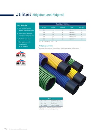 The document provides information on various types of ducting and cable protection systems including Ridgiduct, Ridgicoil, uPVC telecommunications duct, gas ducting, general purpose ducting and Suretwin ducting. It lists the product codes, sizes, lengths and packaging quantities available. The ducting systems vary in their specifications, with some having BBA certification, suitable for underground utilities, low weight and durable materials like polyethylene and PVC.