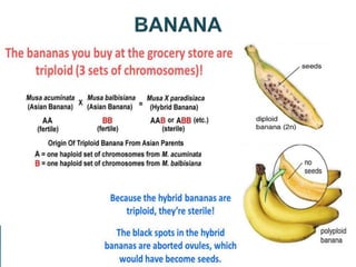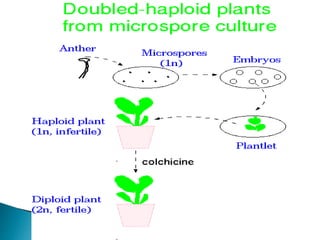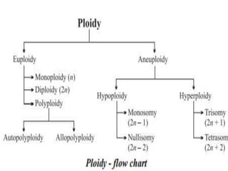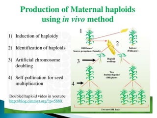 This document discusses polyploidy breeding techniques. It begins by defining different types of chromosome numbers. It then lists factors that determine suitability of crops for polyploid breeding, including whether they are vegetatively propagated or have low chromosome numbers. The main steps of polyploid breeding are described: induction of polyploids, detection of different polyploid types, and handling of polyploids. Specific techniques are provided for producing haploids and diploidizing them. Applications of triploid, tetraploid, allopolyploid and aneuploid breeding are also summarized.