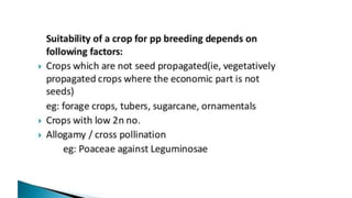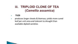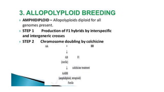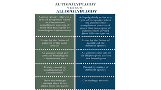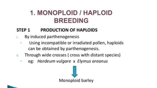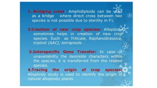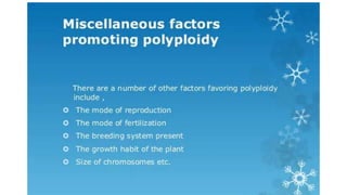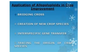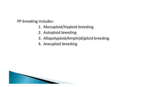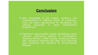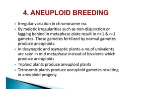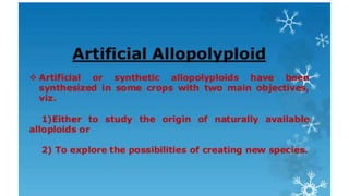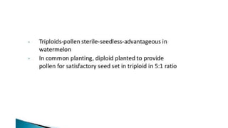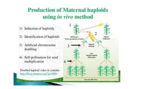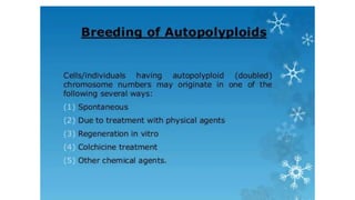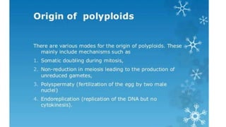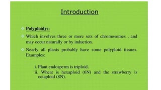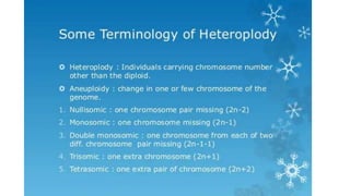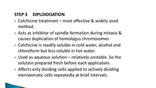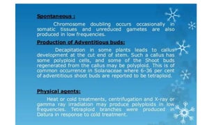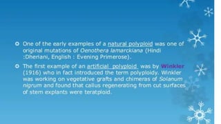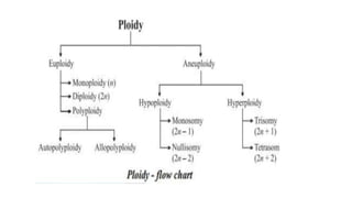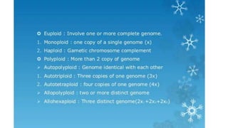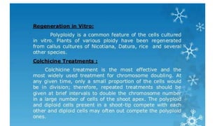 This document outlines the steps involved in plant tissue culture, which are: 1) media preparation, 2) explant selection, 3) establishment of explant in media, 4) callus development, 5) plantlet development, 6) hardening or acclimatization, and 7) open field planting. It then defines euploidy and aneuploidy, explaining that euploidy involves the entire set of chromosomes and can result in single, double, or multiple sets, while aneuploidy is having one or a few extra or missing chromosomes.