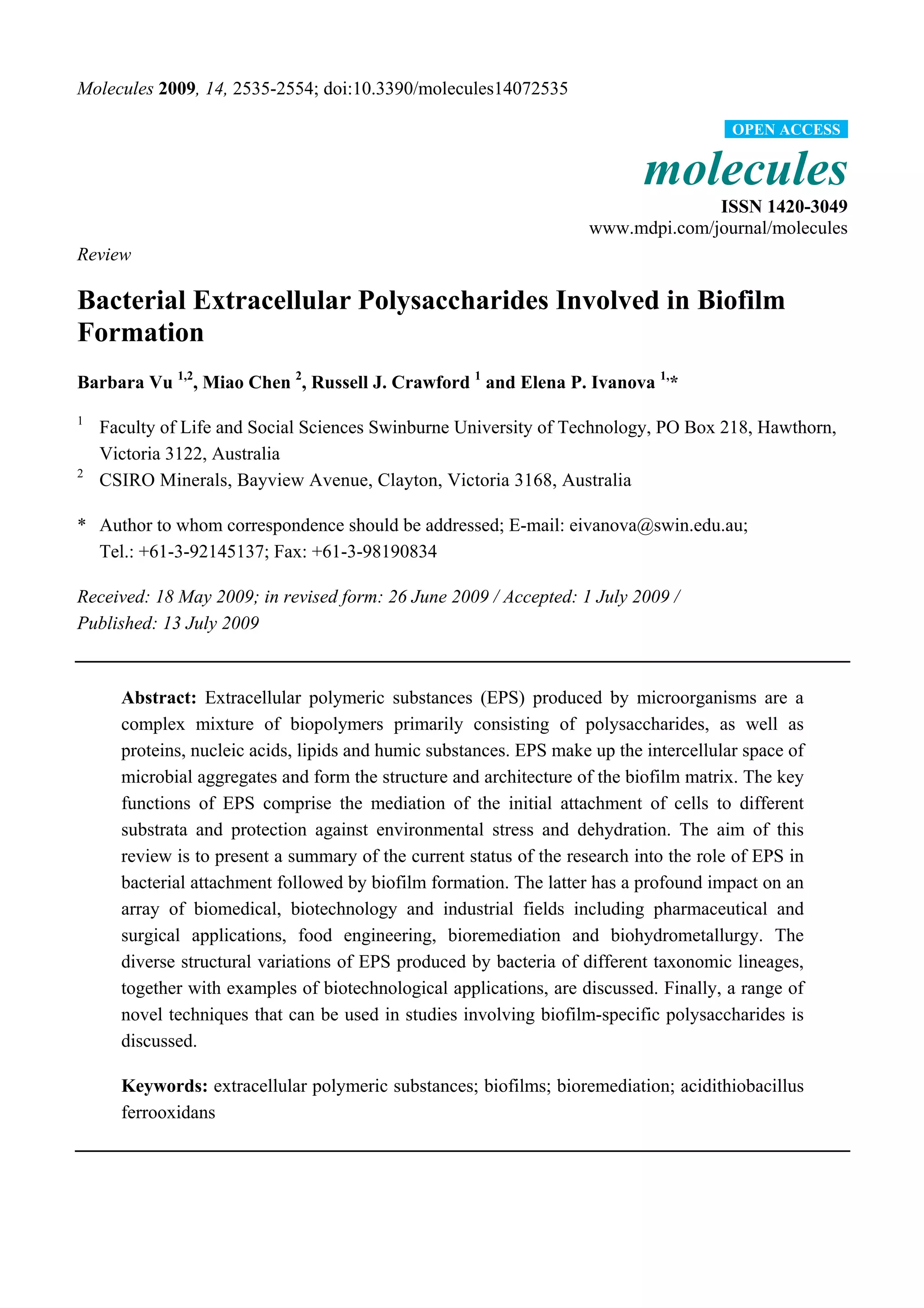 This document reviews the role of bacterial extracellular polysaccharides in biofilm formation. It discusses how extracellular polymeric substances (EPS) produced by microorganisms form the matrix of microbial aggregates and biofilms. EPS are involved in the initial attachment of cells to surfaces and provide protection from environmental stresses. The production of EPS is regulated by quorum sensing and helps mediate processes like bioremediation and bioleaching that are important in industrial applications.