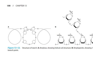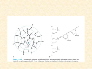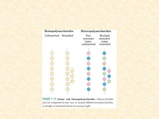 Polysaccharides are polymers of monosaccharides or their derivatives joined by glycosidic bonds. They are classified as homopolymers or heteropolymers. Starch is a major homopolysaccharide composed of amylose and amylopectin, while glycogen is the animal equivalent found mainly in liver and muscle. Cellulose is an insoluble polymer of glucose that provides structure to plant cell walls. Mucopolysaccharides are heteropolymers containing amino sugars and acidic sugars. Common types include hyaluronic acid, chondroitin sulfate, keratin sulfate, heparin, and heparan sulfate. Mucopolysaccharidoses are a group of genetic disorders caused by