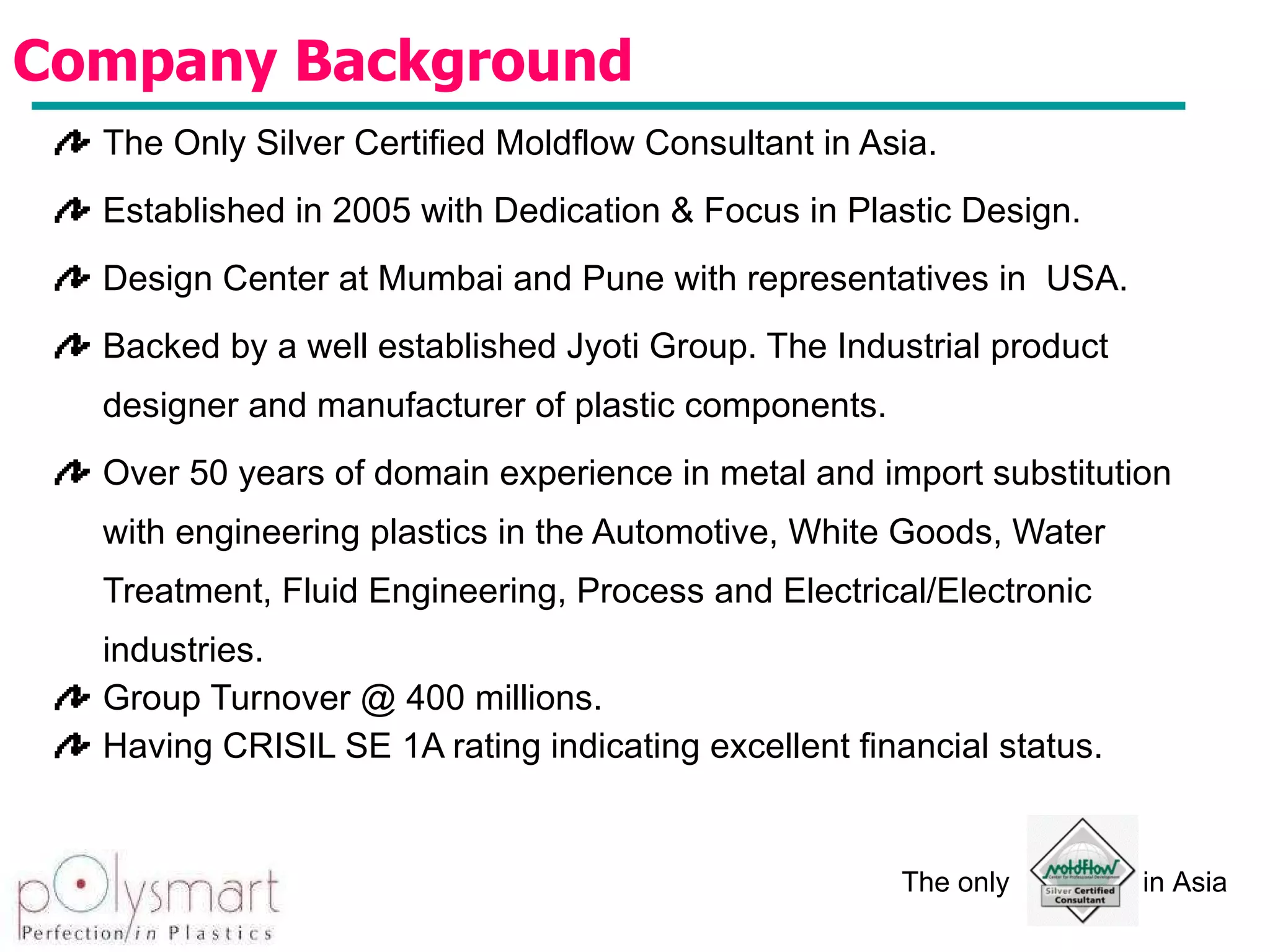 Polysmart is an engineering services company established in 2005 that specializes in plastic design, moldflow analysis, and tool design. It has over 50 years of experience in engineering plastics for industries like automotive and appliances. Polysmart aims to be a world leader in plastics engineering services by offering high quality, cost-effective, and customized solutions to its customers.