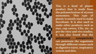 Polystyrene nanoparticles, derived from the polymerization of styrene monomers, are widely used in products like styrofoam, toys, and CDs. These nanoparticles can penetrate organisms via various routes and interact with cellular structures, aided by a protein corona. The document highlights their biocompatibility and transport mechanisms, such as phagocytosis and pinocytosis.