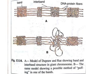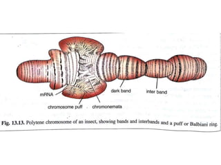Polytene chromosomes are giant chromosomes found in dipteran flies that form through repeated DNA replication without cell division. They begin as normal chromosomes but become large structures with many aligned DNA molecules. Specifically, in Drosophila melanogaster the salivary gland chromosomes undergo multiple rounds of replication to contain around 1000 DNA molecules each. This gives polytene chromosomes their characteristic banded morphology with dark and light regions. Their size allows for high levels of gene expression and production of materials like glue before flies undergo metamorphosis.