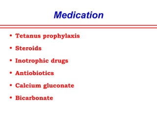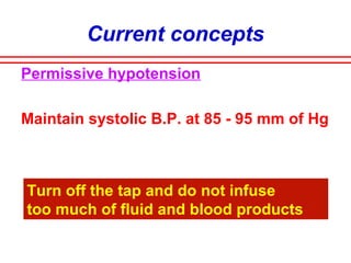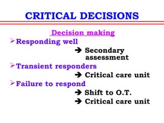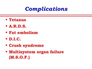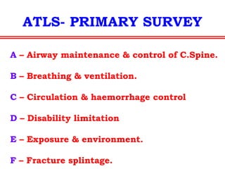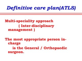 The document discusses polytrauma and its management, highlighting its significant impact on mortality and healthcare costs in both the UK and USA. It covers injury mechanisms, triage procedures, and the Advanced Trauma Life Support (ATLS) protocol, emphasizing the importance of swift intervention and management by a specialized trauma team. Additionally, it addresses complications arising from trauma, the need for a multi-specialty approach in treatment, and the necessity for improved funding and legislation to tackle high-velocity trauma effectively.