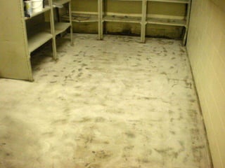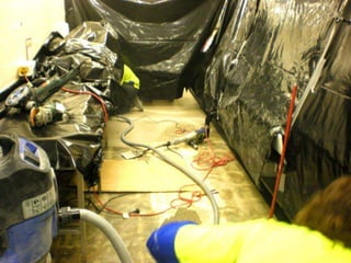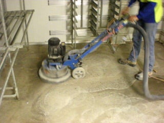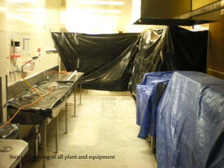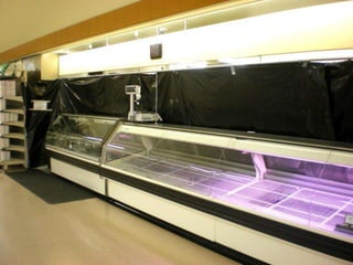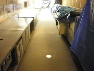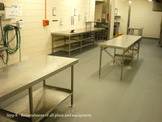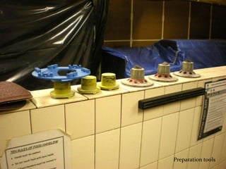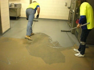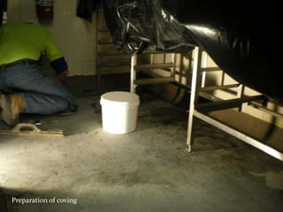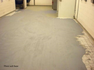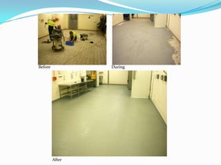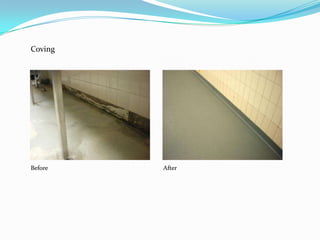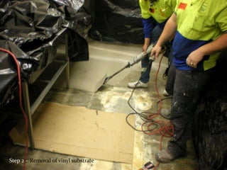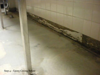 The document outlines 8 steps for supermarket floor repairs using polyurethane non-slip flooring: 1) covering equipment, 2) removing old vinyl, 3) prepping the floor, 4) applying epoxy coving, 5) laying the new polyurethane flooring, 6) applying a top coat, 7) finishing the floor and coving, and 8) reinstalling equipment. The process involves removing the existing vinyl substrate, prepping the floor sub base, applying epoxy coving and polyurethane non-slip flooring, and finishing with a top coat.
