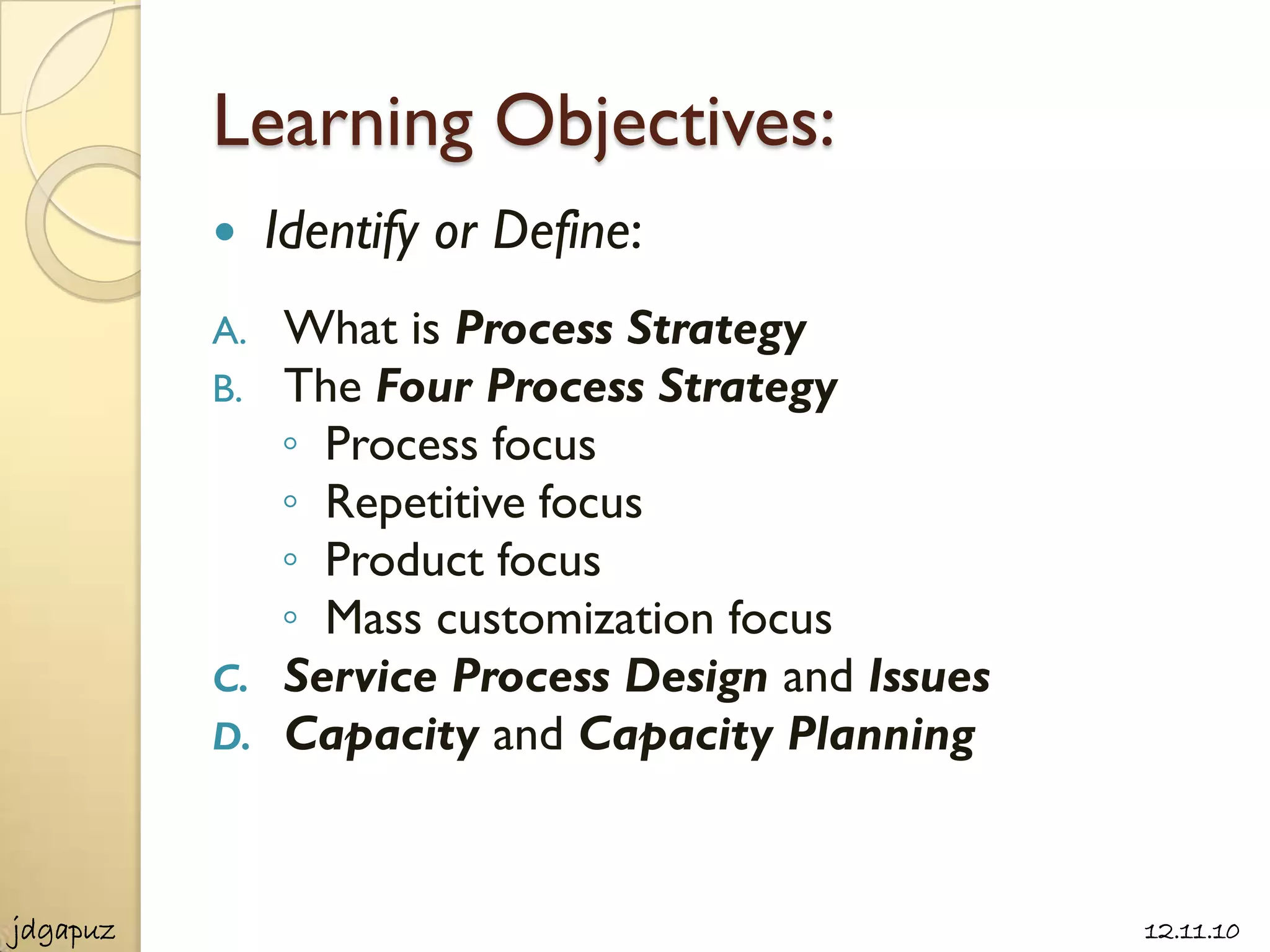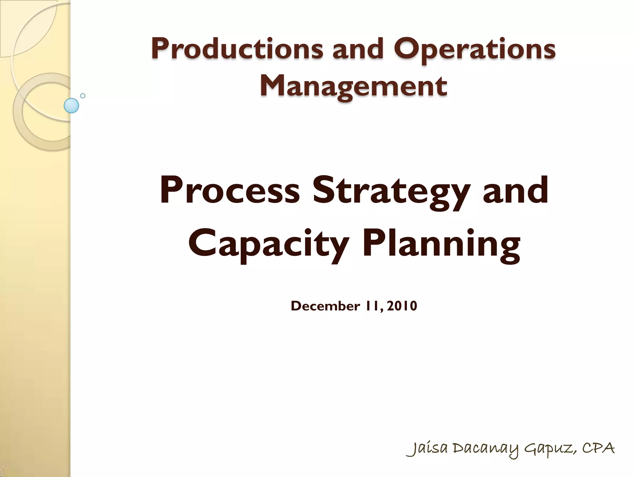 The document discusses process strategy and capacity planning. It begins by defining process strategy as an organization's approach to transforming resources into goods and services. It then describes four main types of process strategies: process focus, repetitive focus, product focus, and mass customization focus. Each strategy is characterized based on factors like product variety, equipment use, and employee skills. The document also covers tools for analyzing and designing processes like flow diagrams, process charts, and time-function mapping.