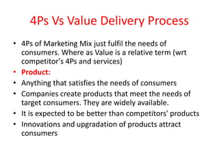 This document discusses marketing principles including the 4Ps (Product, Price, Place, Promotion) and the value delivery process. It explains that the 4Ps fulfill customer needs but value is relative based on competitors. It then defines each P and how companies can enhance value at each step through approaches like using quality materials, efficient distribution channels, and widely available products. Communicating additional benefits beyond the product is key to promoting value. The marketing environment that affects strategy is also summarized, including micro factors like suppliers, customers and competitors, and macro external forces.