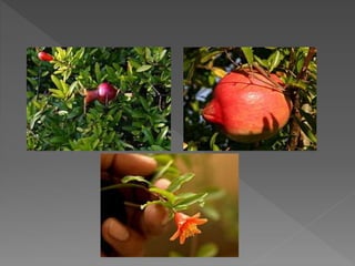 This document describes the pomegranate plant. It is native to the region from Persia to the western Himalayas. It is an ornamental tree or shrub that is drought tolerant and can grow in dry soil. The fruit is a berry with thick reddish skin that contains seeds embedded in white pulp. Pomegranates grow best in tropical or subtropical climates with hot, dry summers and some cold tolerance. They prefer well-draining, slightly acidic to neutral soil. Propagation is usually through air layering or hardwood cuttings in late winter to early spring. Pomegranates have several health benefits and can be eaten fresh, made into juice or used in cocktails or as