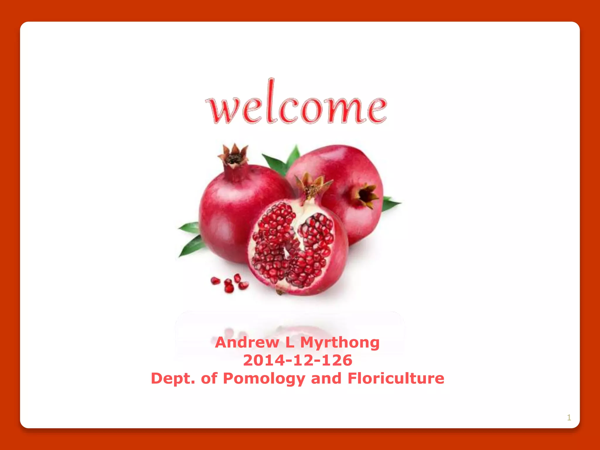 This document provides information on the pomegranate plant. It begins with the scientific classification of pomegranate and mentions that its common names include pomegranate, granada, and grenade. It is native to Iran and adapted to semi-arid climates with hot summers and cool winters. The document then discusses the world and Indian production scenarios of pomegranate. It also provides details on the botany, cultivation practices such as propagation, planting, training, pruning, fertilization and irrigation of pomegranate plants. Finally, it describes the pests and diseases that affect pomegranate and their management strategies.